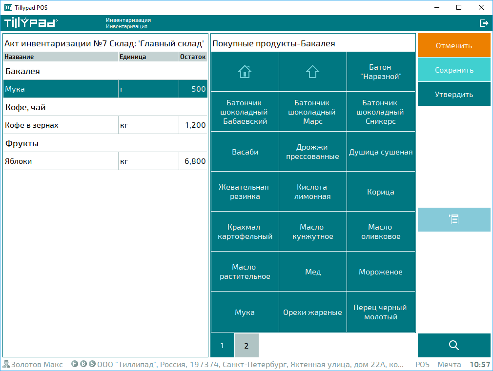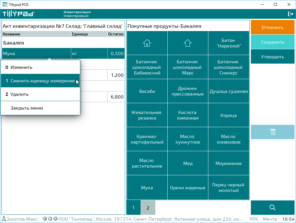 Выбирать продукты в акт инвентаризации можно поиском по вхождению или с помощью сканера штрихкодов и весов, подключенных к POS-терминалу.